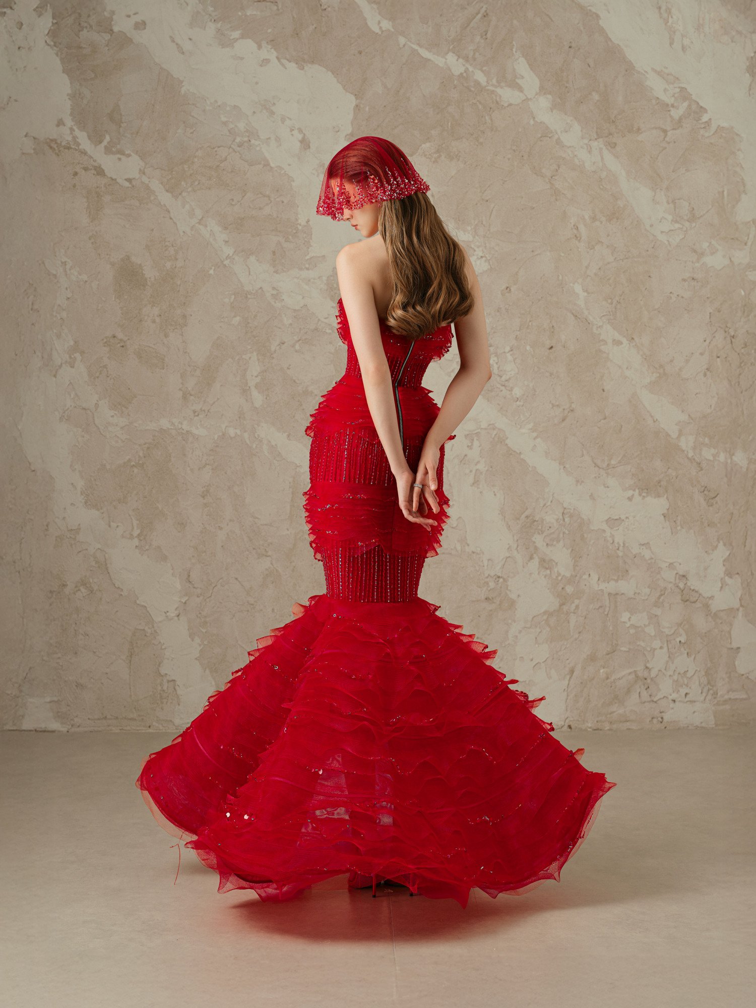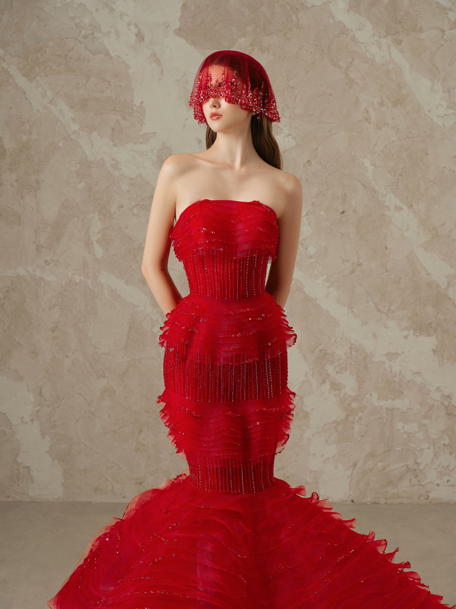 Stunning crimson mermaid gown crafted from premium chiffon featuring strapless corset with crystal embellishments. Multi-layered ruffle technique creates dramatic 3D silhouette with hand-sewn sequin detailing. Embellished tulle veil adds mystique. Exclusive haute couture piece for young socialites who embrace bold glamour and luxury sophistication.