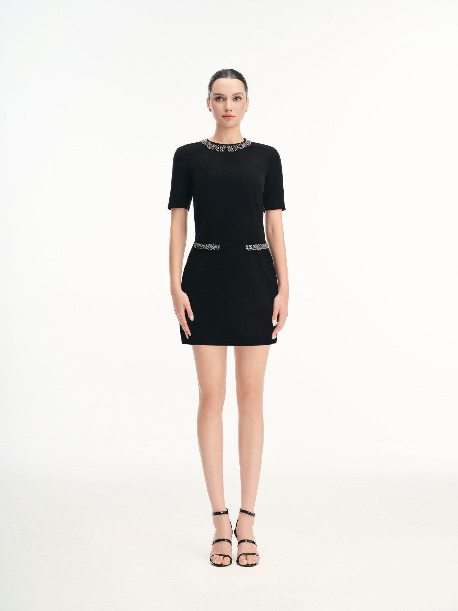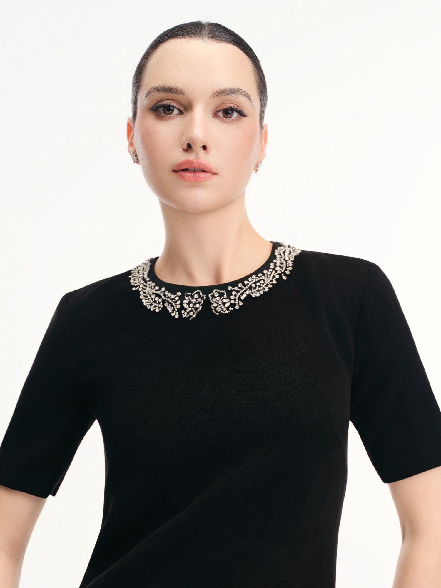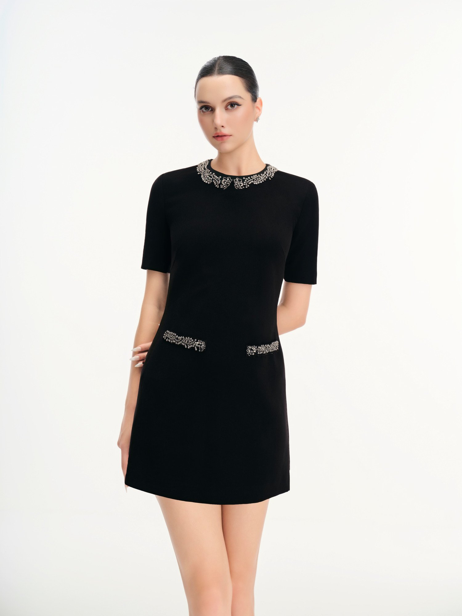 Modern Elegance Perfected with The design crafted from premium rmateriall with meticulous tailoring techniques, this classic shift dress features exquisite hand-embroidered crystal and metallic bead embellishments adorning the neckline and patch pockets. Structured short sleeves and a gently flattering A-line silhouette create timeless sophistication.