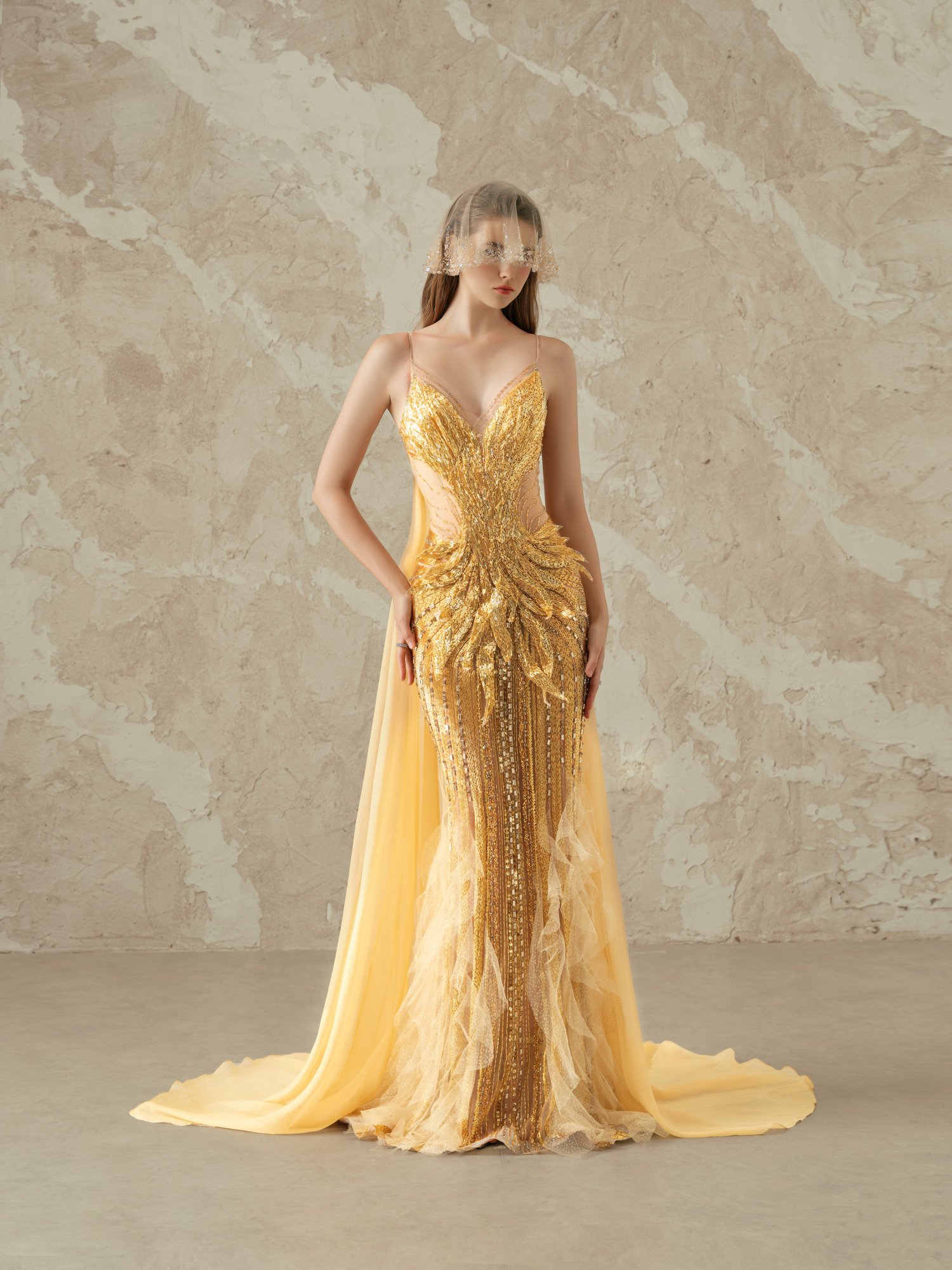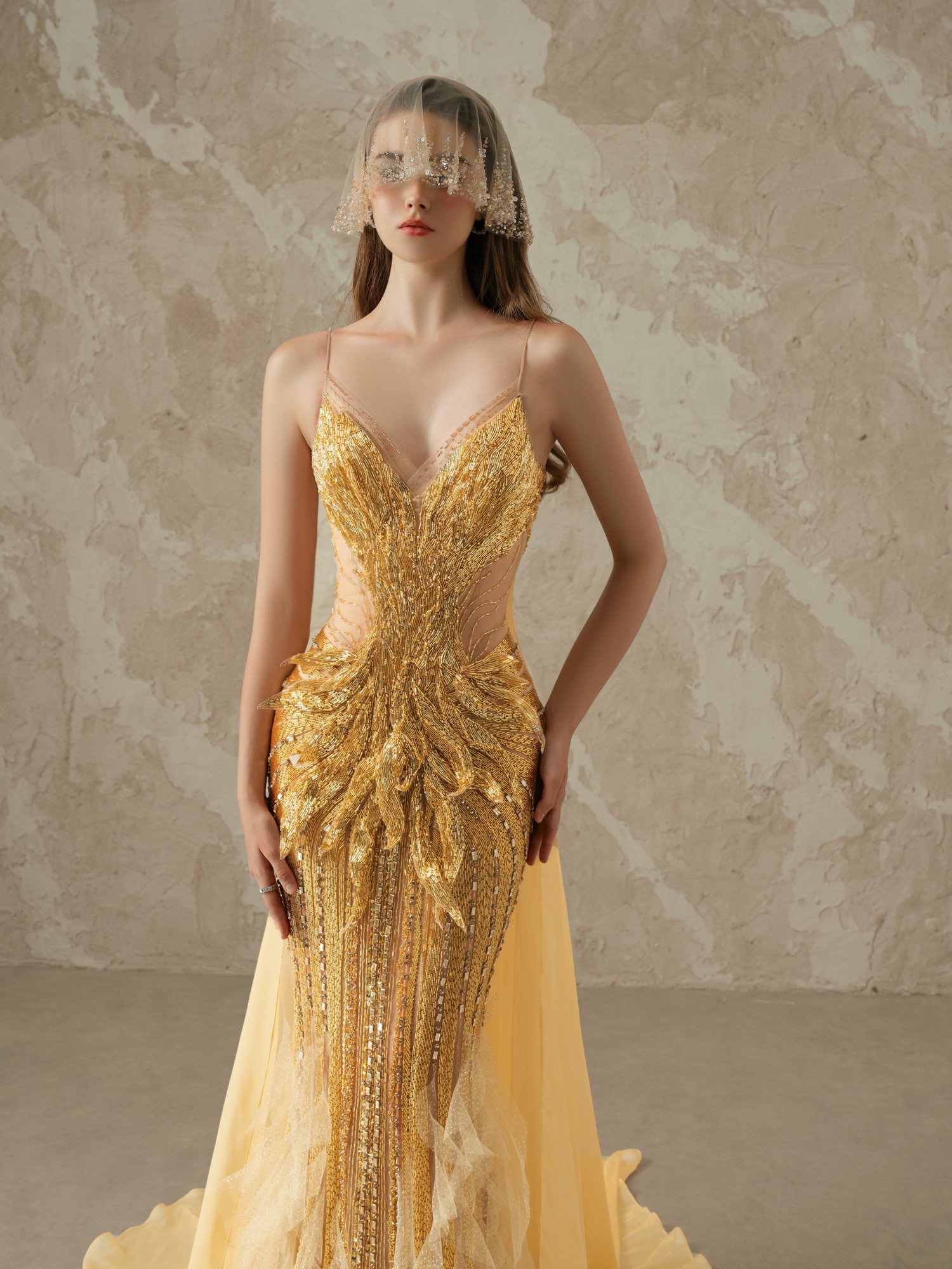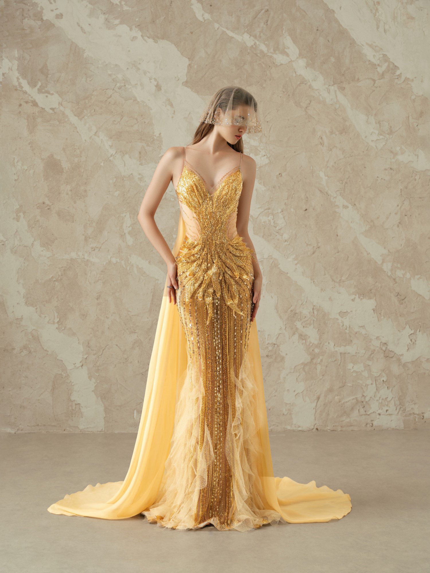 Magnificent golden phoenix gown in premium silk with intricate hand-embroidered phoenix motifs using metallic threads and sequins. Features fitted mermaid silhouette with dramatic cathedral train. Haute couture embroidery techniques with luxurious silk dupioni lining. A symbol of power and elegance for life’s most extraordinary occasions.