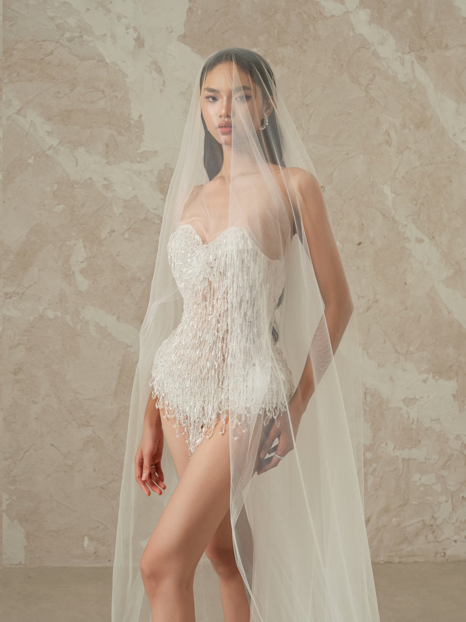 Timeless bridal elegance featuring intricately beaded strapless bodice and voluminous silk organza A-line skirt. The dramatic 3-meter cathedral veil creates regal grandeur while hand-placed beadwork follows classical patterns. A heritage piece celebrating traditional couture craftsmanship and eternal romance.