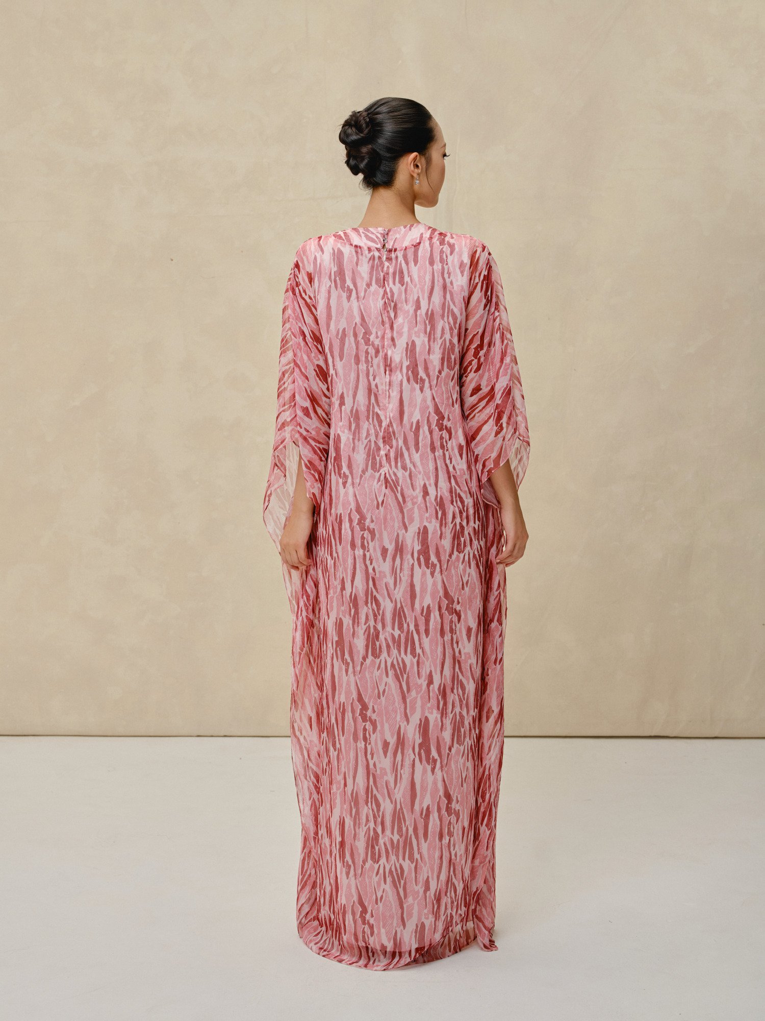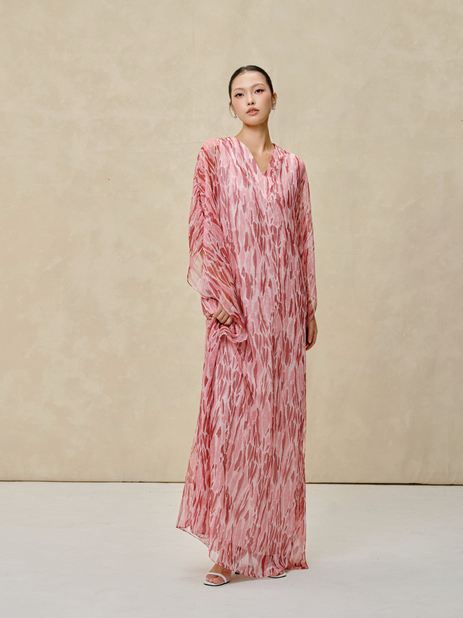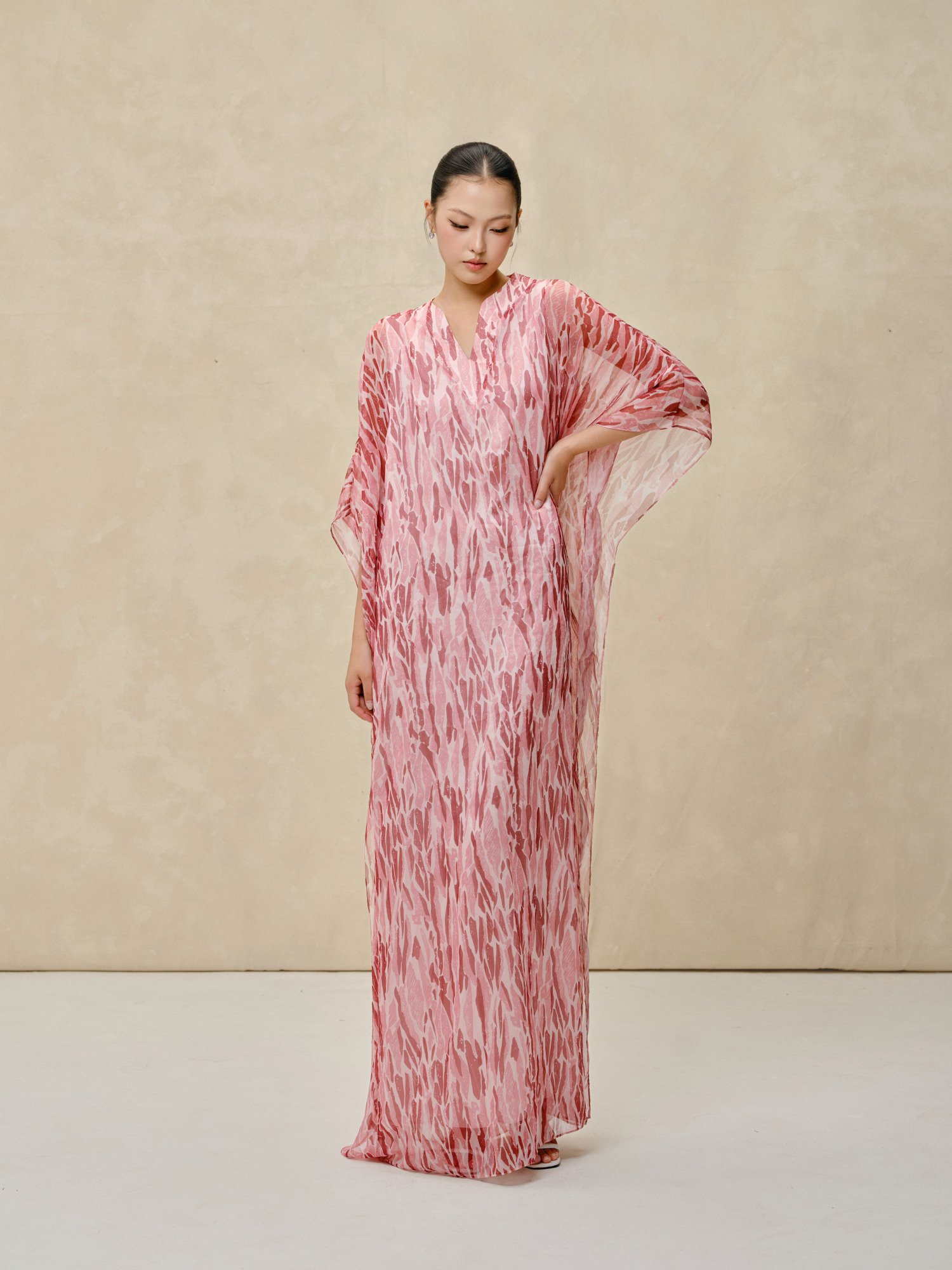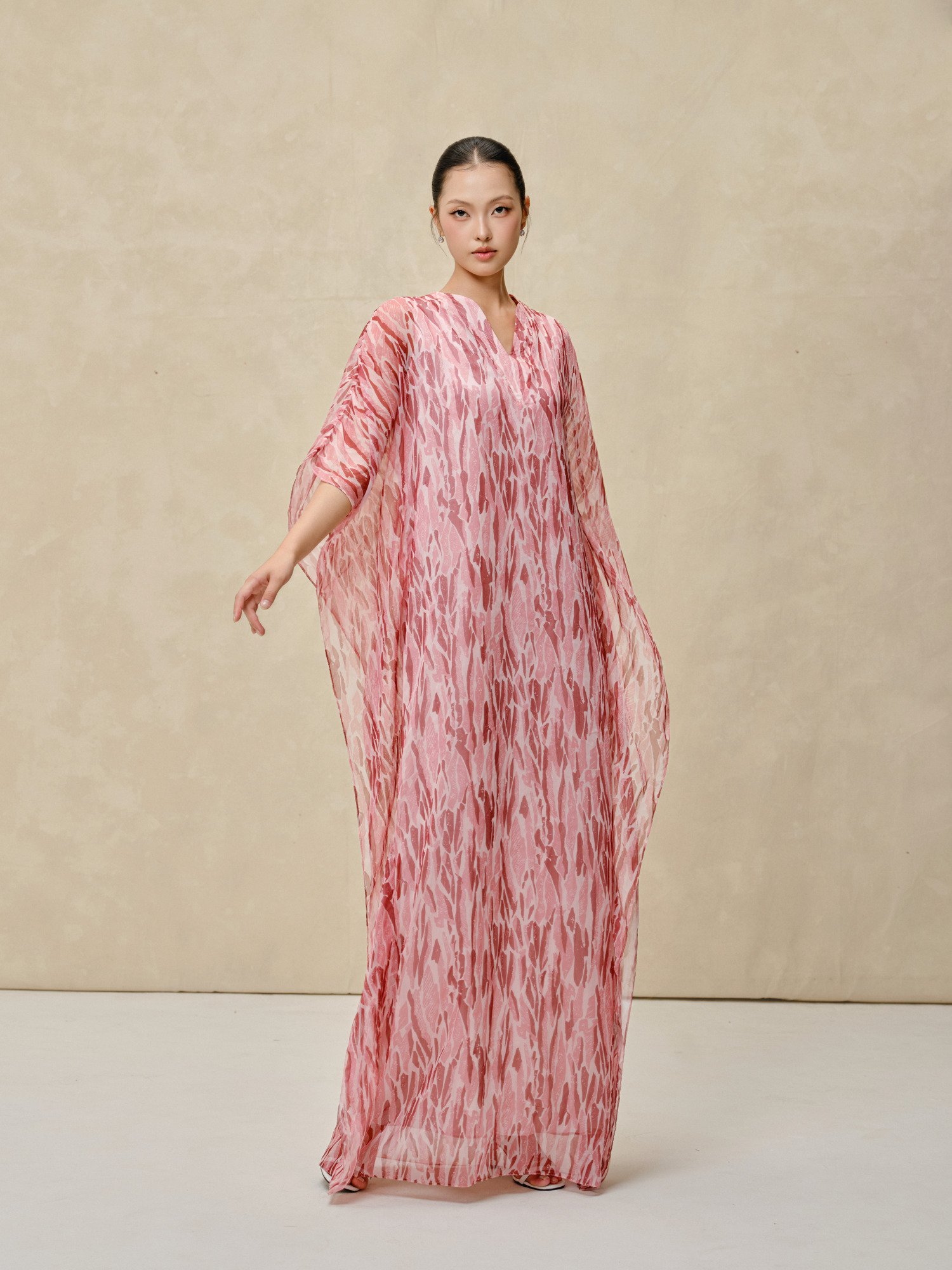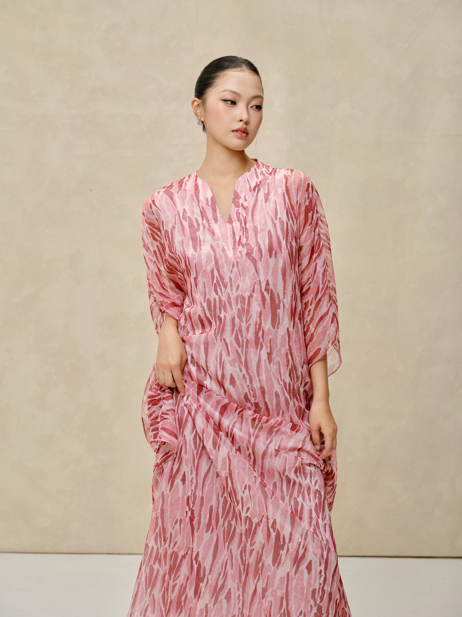 Thiết kế vừa phóng khoán, vừa đủ sang để xuất hiện ở những bữa tiệc đáng nhớ nhất – Kaftan Dress với lụa voan họa tiết trừu tượng tông nude rose, tay kimono bay bổng và hoa nổi khối điểm eo sẽ khiến nàng cảm thấy như chính mình — nhẹ nhàng, quyền quý vào mùa hè này.