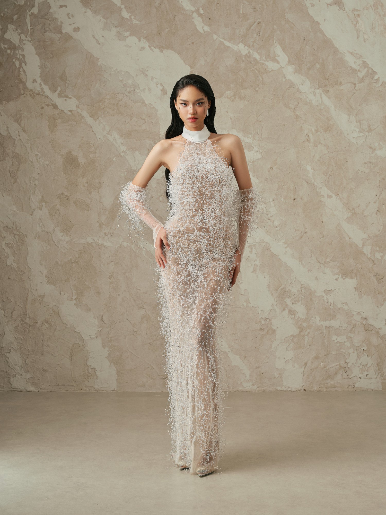 Halter-neck evening gown in sheer tulle adorned with thousands of premium crystal beads using meticulous hand-beading techniques. Alluring backless design paired with unique detachable sleeves. Figure-hugging mermaid silhouette with gradient beading creates mesmerizing light effects for exclusive gala occasions.