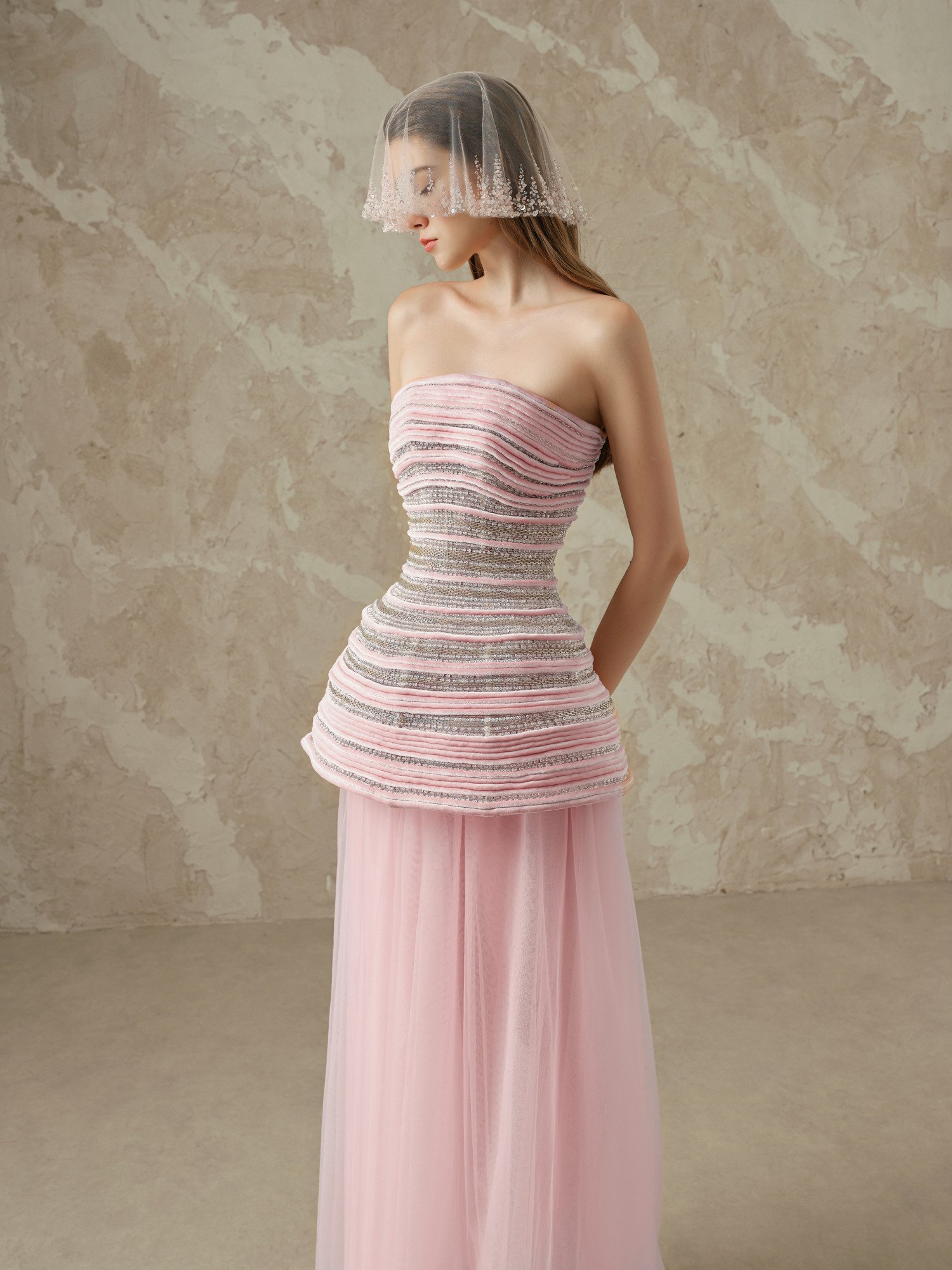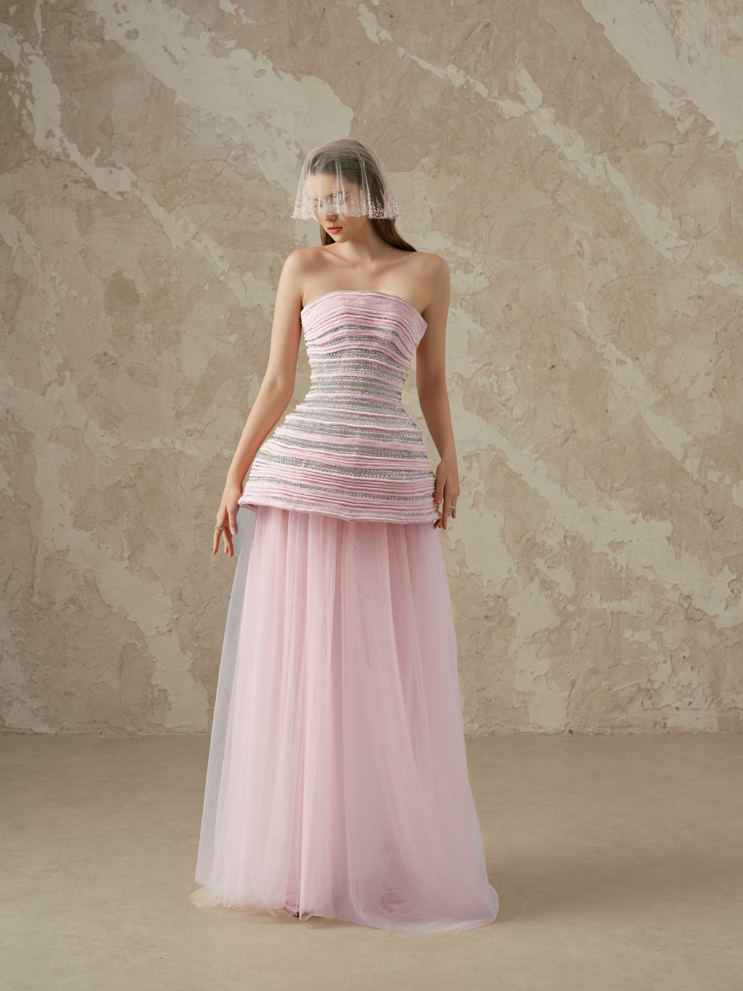 Exquisite two-tier strapless evening gown in pure blush silk organza featuring hand-embroidered bodice with couture thread work technique, creating horizontal stripe patterns using metallic threads and crystal micro beads. Flowing tiered tulle skirt with premium silk taffeta lining, complemented by Alençon lace face veil adorned with pearl embroidery. A masterpiece crafted for the most romantic elite soirées where elegance meets contemporary sophistication.