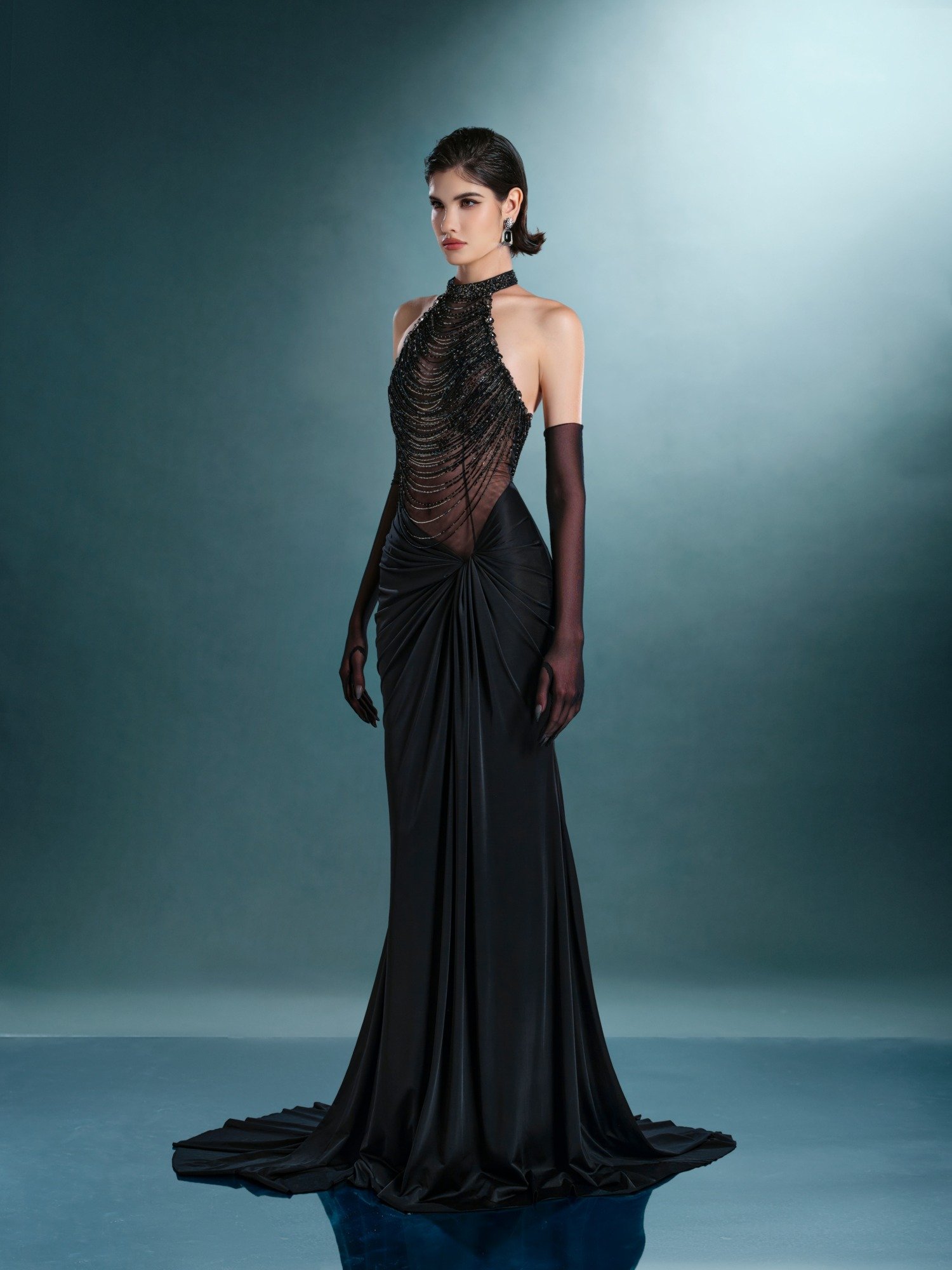Halter gown featuring handcrafted silver chain mail using medieval armor techniques. Premium silk crepe with asymmetric cut creates seductive movement. Each link is hand-polished for perfect lustrous finish.
