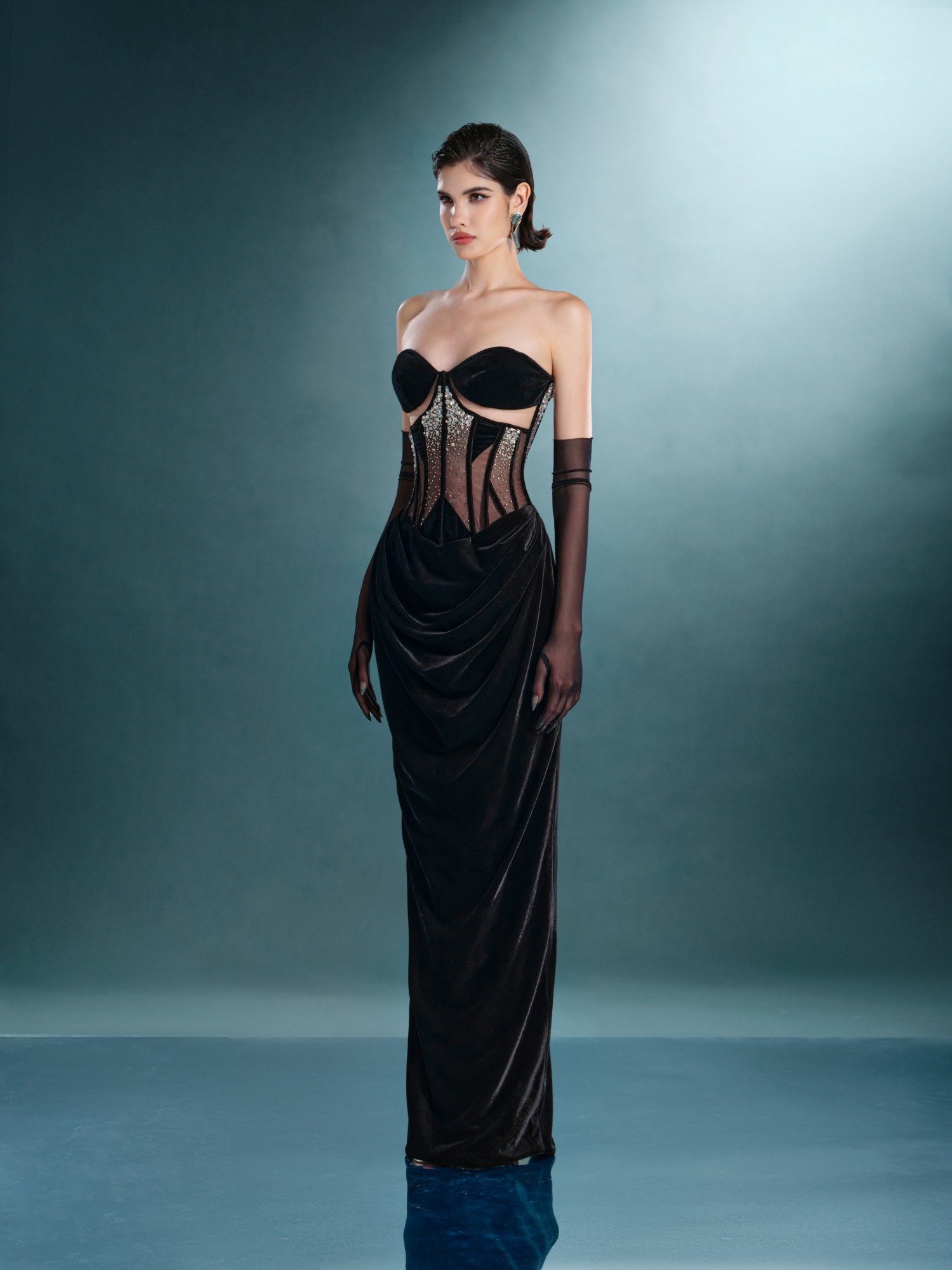 Black corset gown with premium steel boning creating perfect hourglass silhouette. Lyonnais velvet with crystal mesh using 18th-century construction techniques. Draping details achieve absolute drama and elegance.