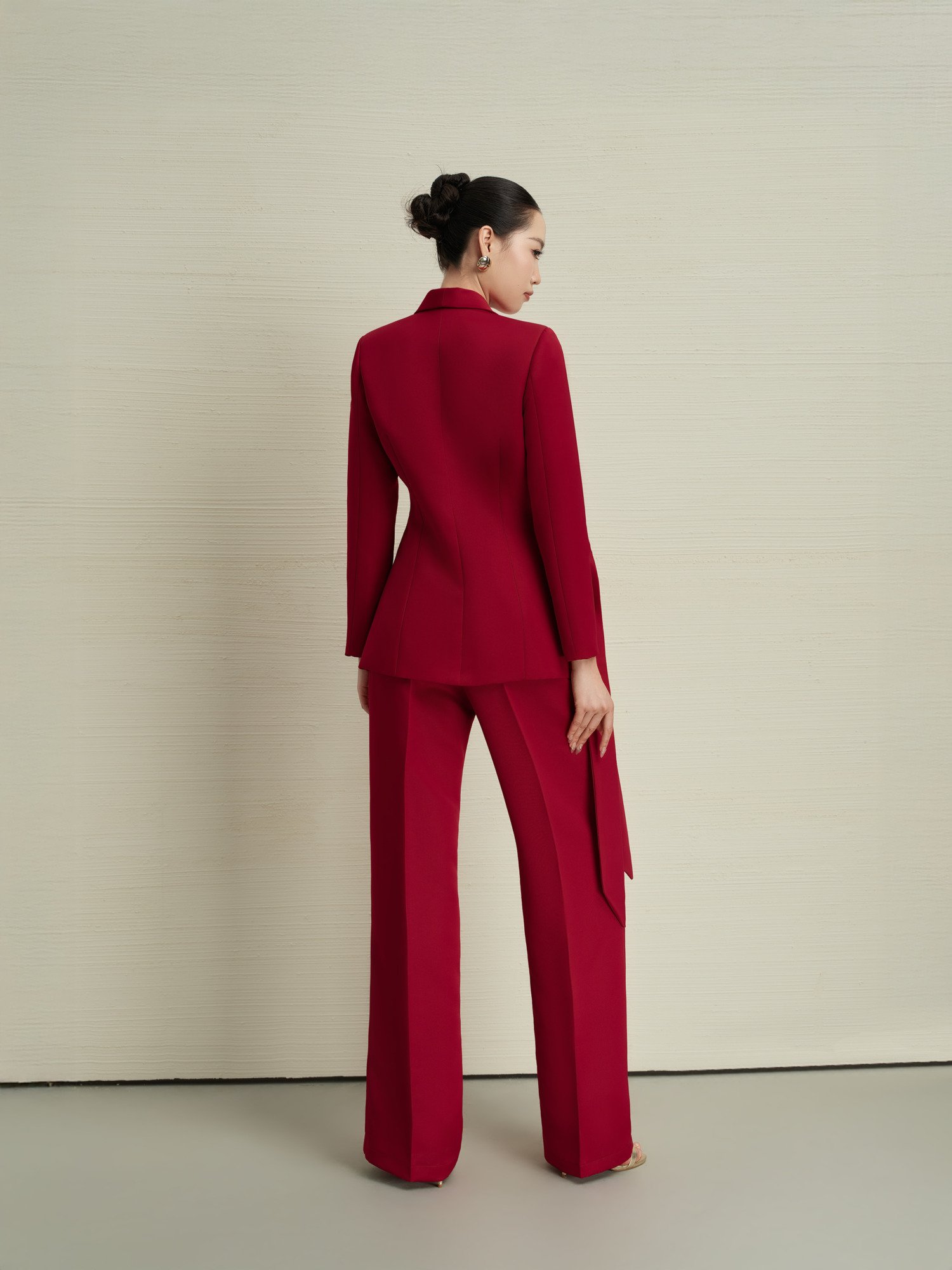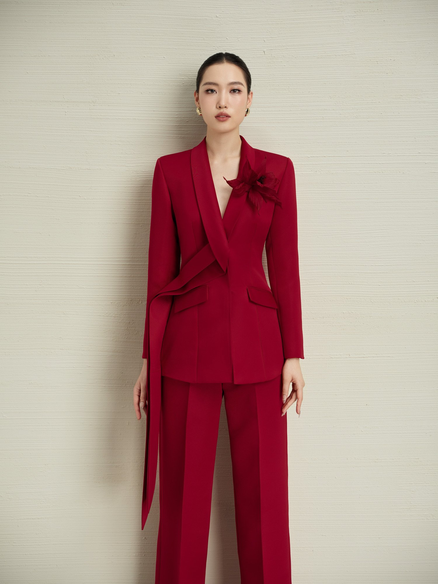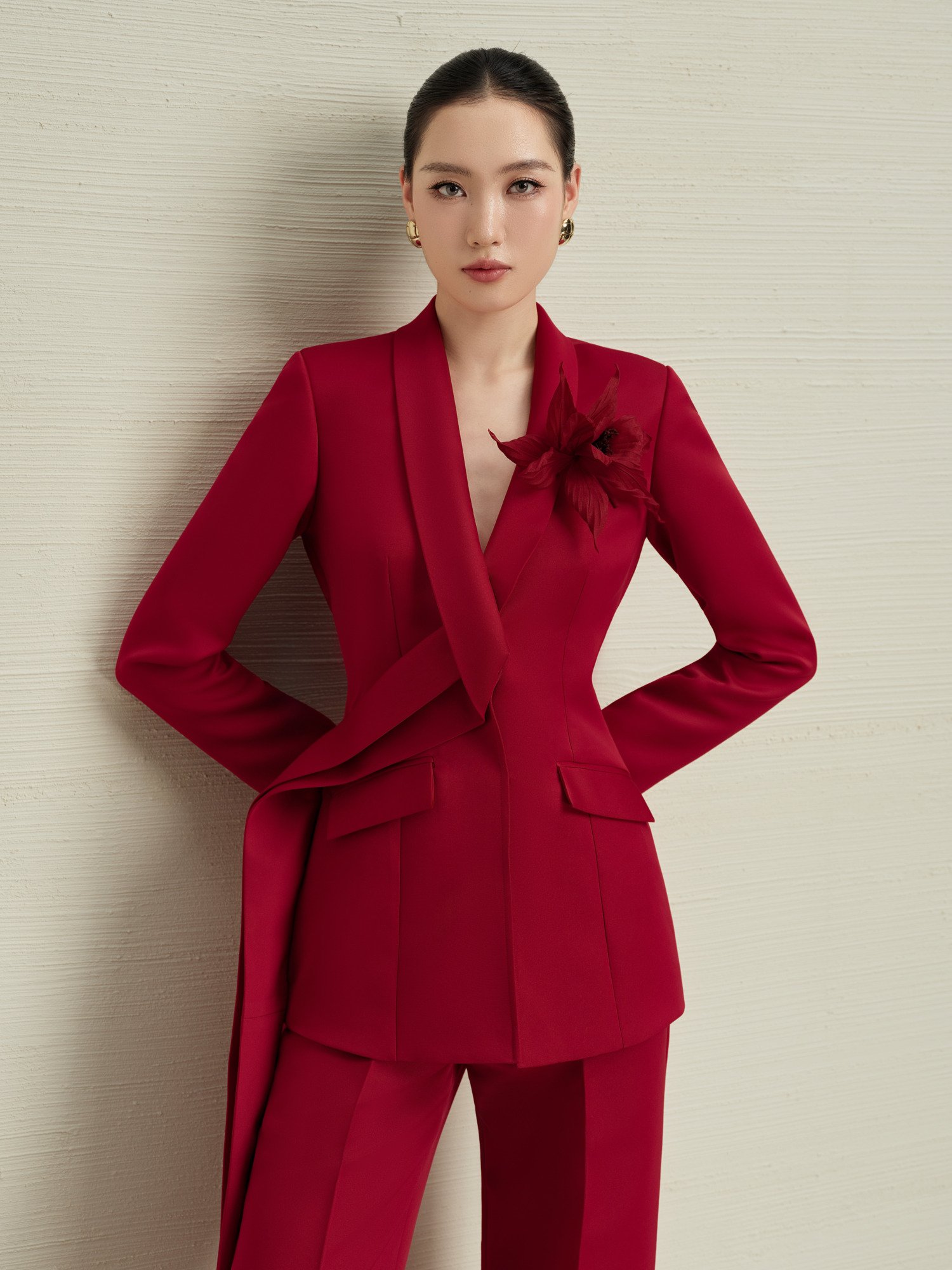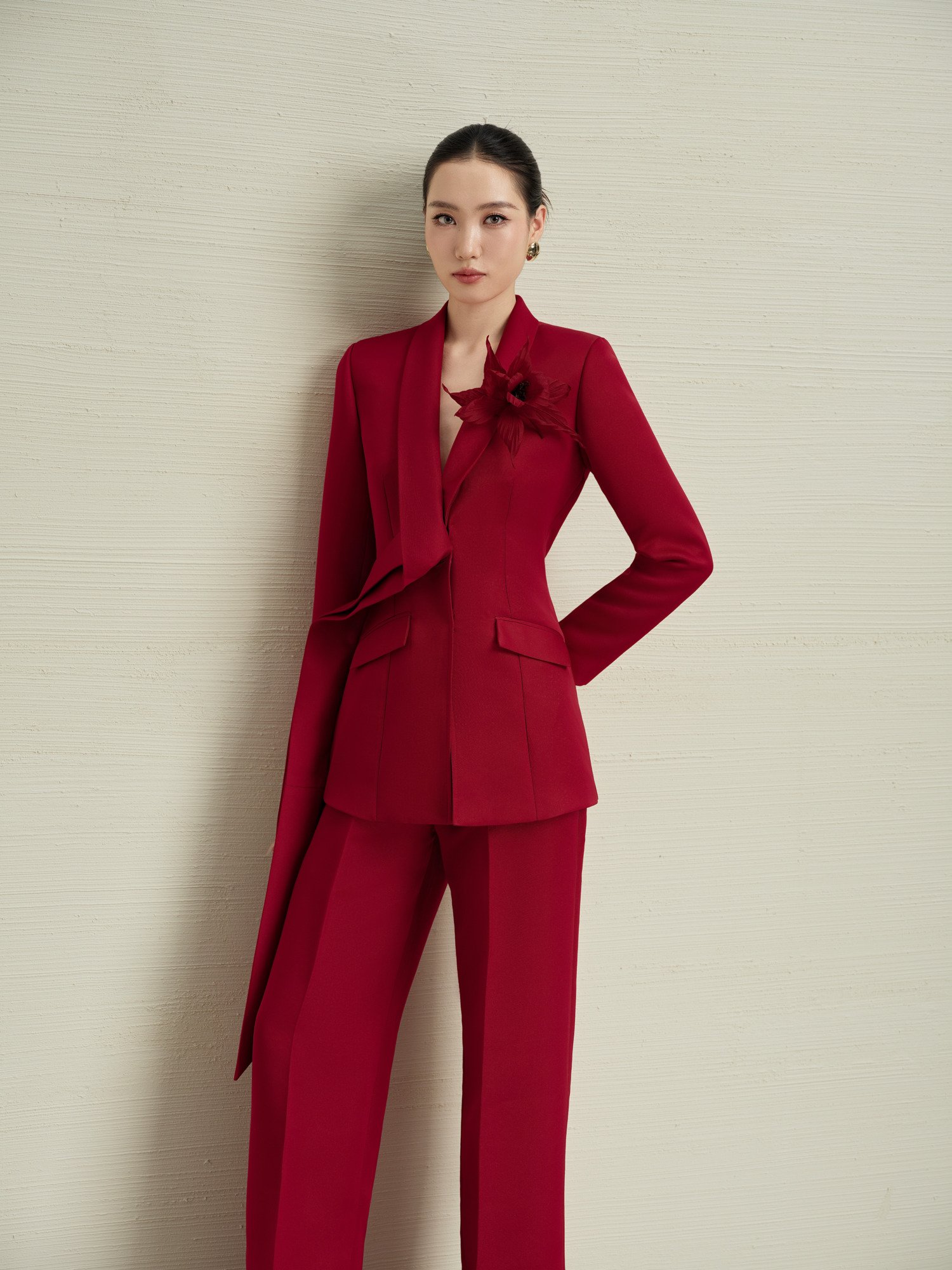 Biểu tượng sức mạnh nữ tính với sắc đỏ ruby quý phái trên nền vải len cao cấp kết hợp lụa tơ tằm mềm mại. Thiết kế blazer cổ vest thanh lịch với chi tiết hoa 3D thủ công tinh xảo, đường cut ôm eo hoàn hảo tôn dáng. Quần ống loe chuẩn tỷ lệ vàng kéo dài đôi chân. Kỹ thuật tailoring Âu cổ điển với lớp lót cao cấp đảm bảo độ cứng cáp và sang trọng. Set suit này khẳng định vị thế của người phụ nữ thành đạt tại các cuộc họp quan trọng và sự kiện thượng lưu.