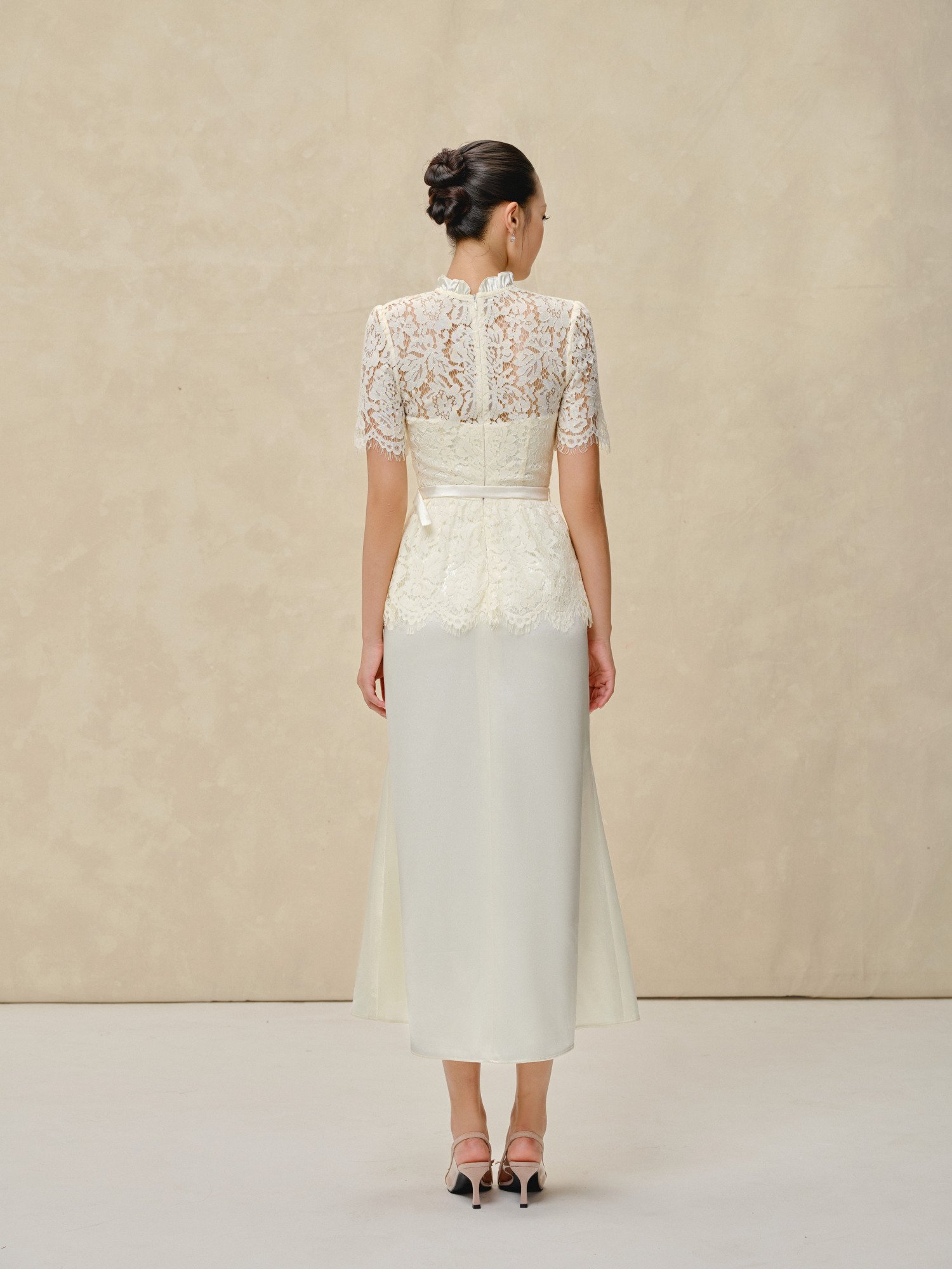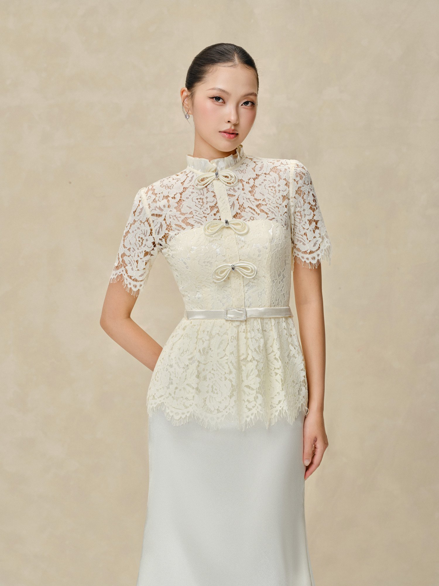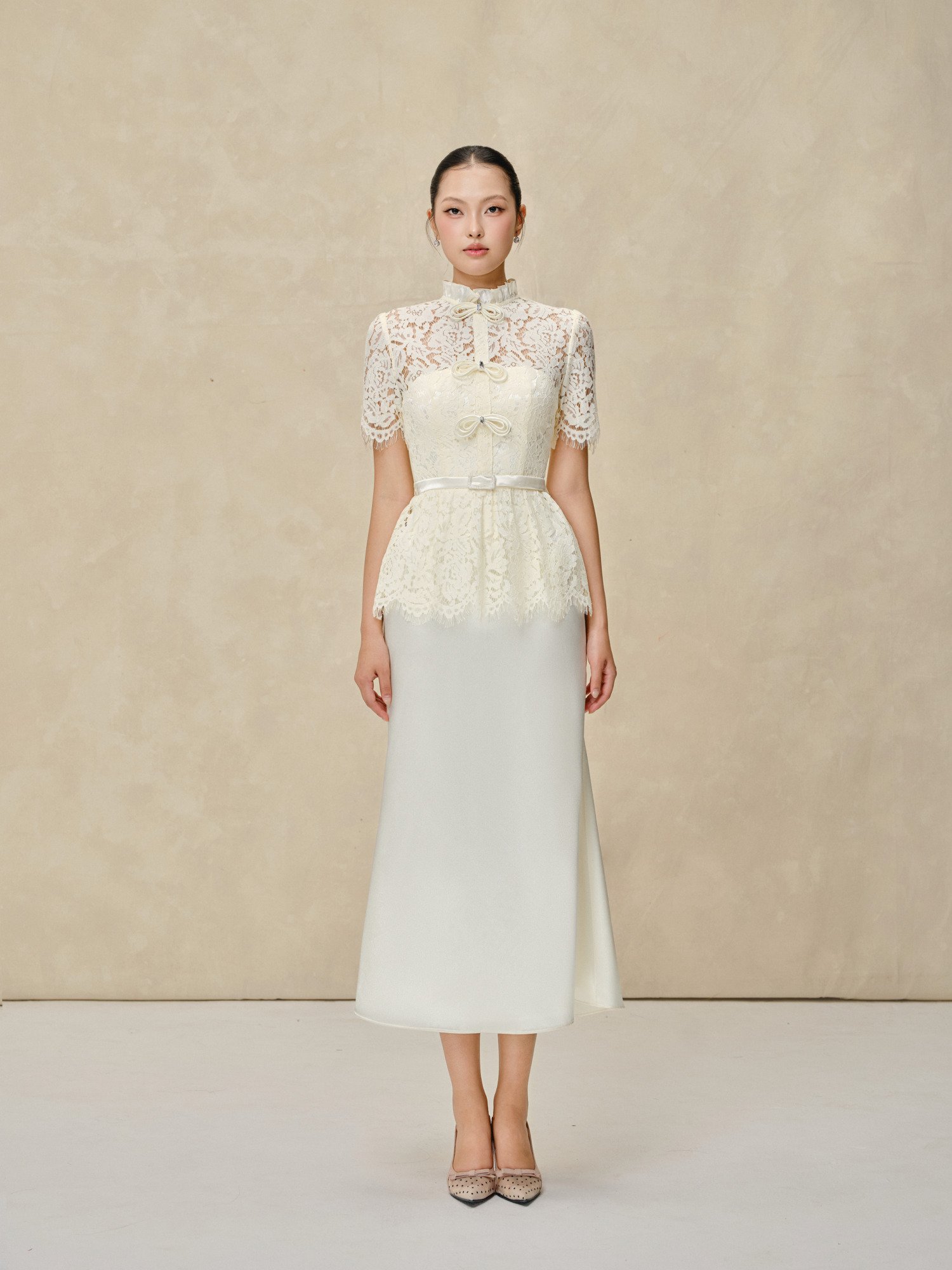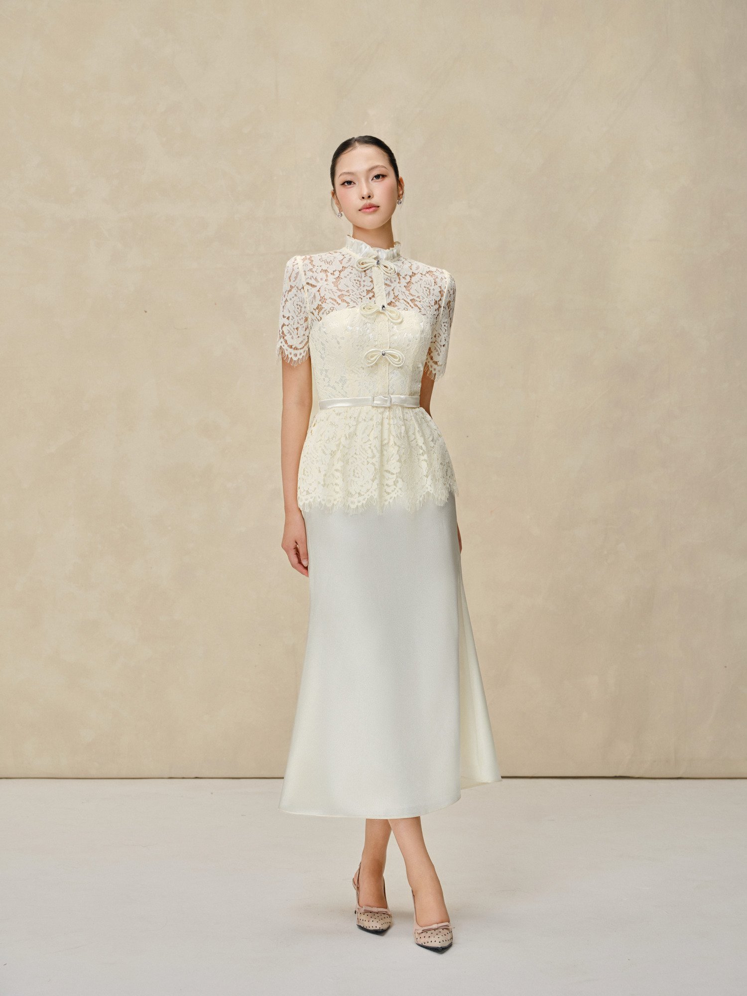 Sự thuần khiết không phải là sự đơn giản — đó là sự chắt lọc của những gì tinh tế nhất. White Lace Dress với thân ren hoa xuyên thấu, peplum tôn eo và chân váy lụa mềm rót — mang vẻ đẹp vừa thánh thiện vừa quyền quý, như người phụ nữ chưa bao giờ cần cố gắng để được nhớ đến.