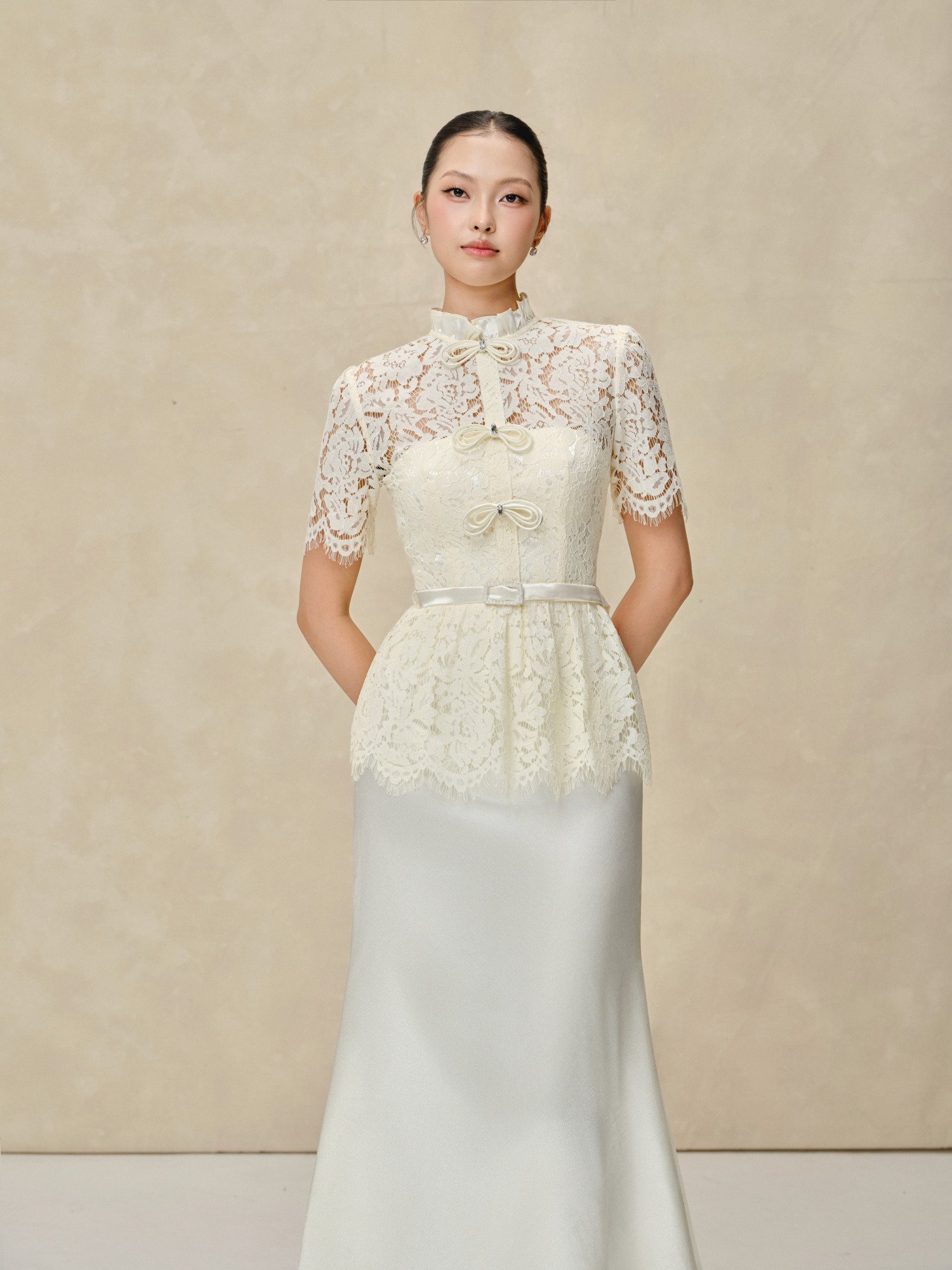 True refinement is never decorated — it is distilled. White Lace Dress layers sheer floral lace over a sculptured peplum and falls into a fluid silk skirt, composing a silhouette that is at once ethereal and unmistakably powerful. Khám phá và đặt hàng ngay tại LE NGOC LAM.